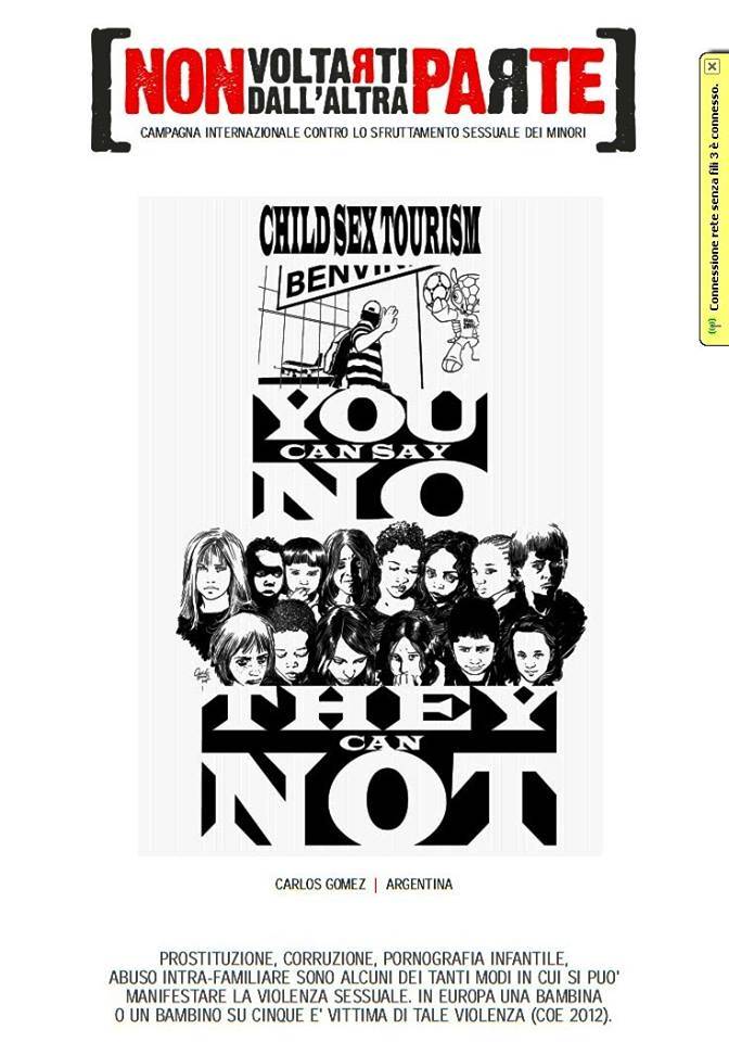 N.B.: Joào Pedro fa riferimento ad una campagna avviata in occasione dei Mondiali di Calcio, contemporaneamente in Italia e in Brasile, FORMATA DA QUINDICI OPERE messe a disposizione da artisti di satira di fama internazionale (allegate in formato web). La campagna ha l’obiettivo di far sorgere dubbi in chi, spesso con la scusa dell’aiuto economico alla famiglia, mette in atto una delle azioni più vergognose che l’uomo possa vigliaccamente intraprendere su di un minore.