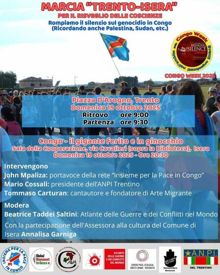 MARCIA TRENTO – ISERA Per il risveglio delle coscienze. Rompiamo il silenzio sul genocidio in Congo (ricordando anche Palestina, Sudan, ecc). Ci troveremo in Piazza d’Arogno a Trento, domenica 19 ottobre 2025. Ritrovo ore 9:00 Partenza ore 9:30