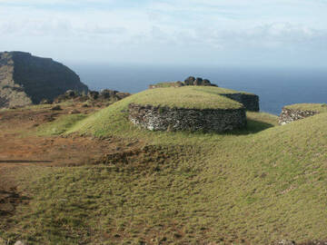 Nell'immagine in basso è possibile vedere alcune delle 1.233 abitazioni preistoriche in pietra, chiamate Tupa, in tempi antichi, e hare moa (casa delle galline), in tempi più recenti, che costellano l'isola di Pasqua, Rapa Nui